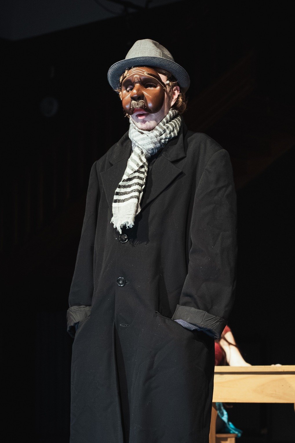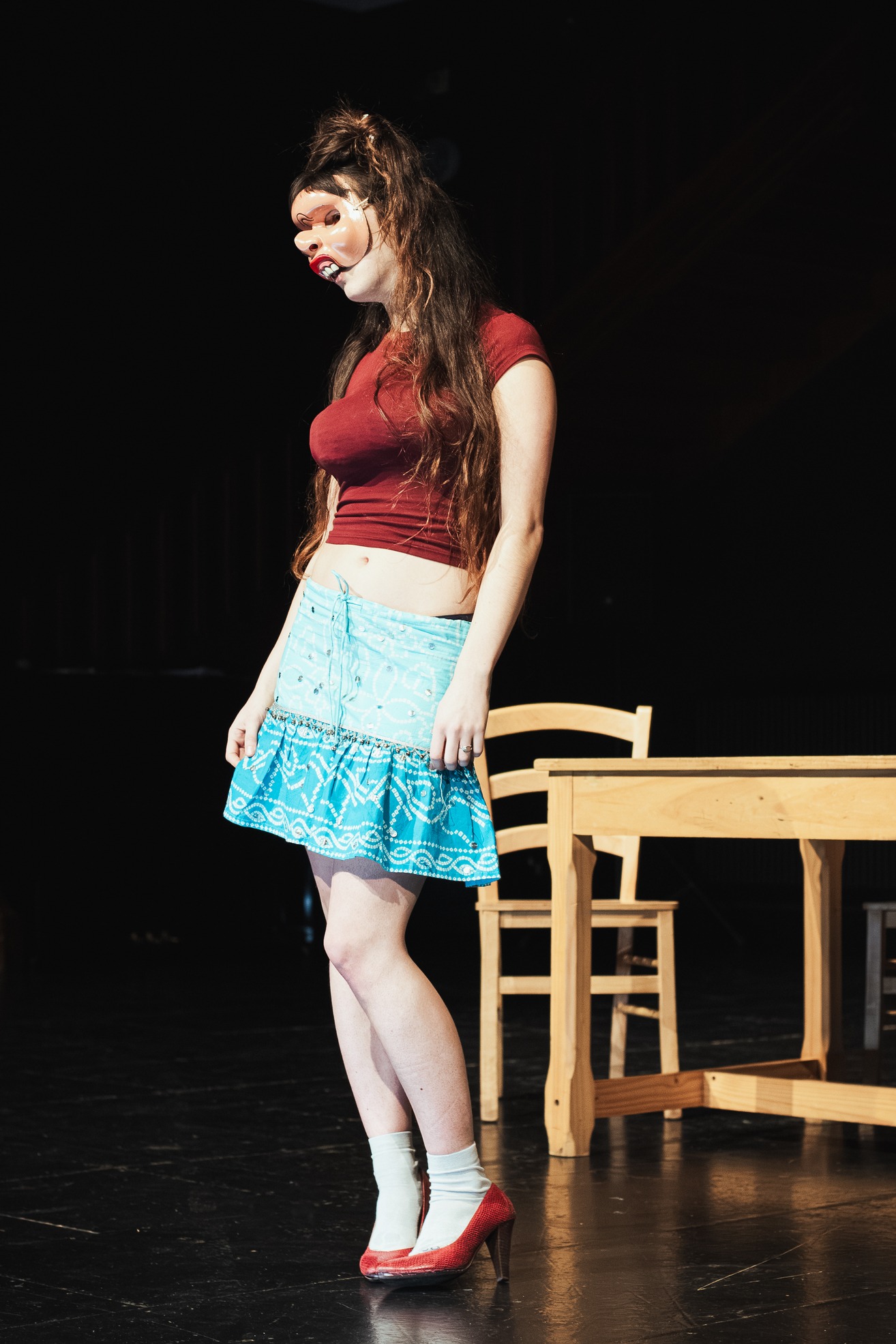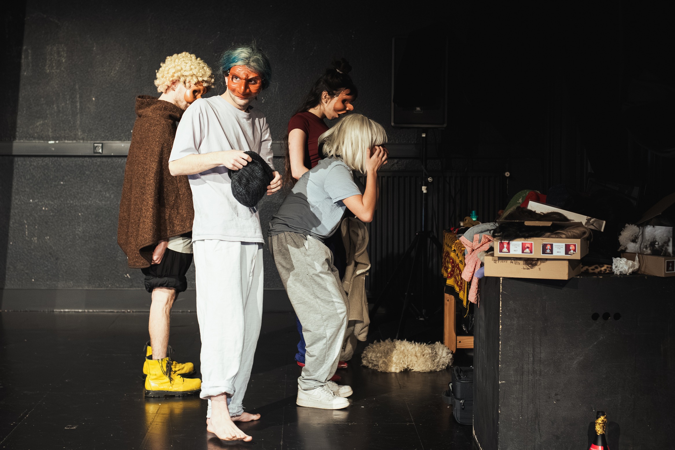 Avec Carolina Pecheny, les élèves ont réalisé des improvisations et travaillé un personnage pour aboutir, à la fin du stage, à la création d’un court tableau racontant une petite histoire de vie du masque qu’il ou elle a choisit.